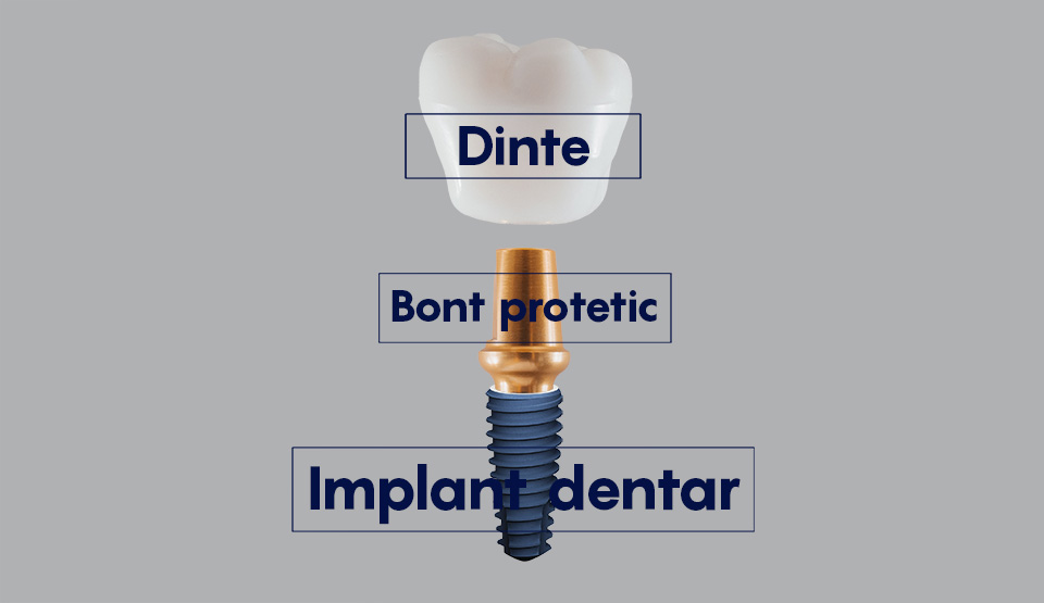 O lucrare protetică pe implanturi include 3 componente: implant, bont protetic, coroană dentară.